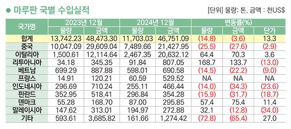 마루판 국별 수입금액은 중국>이탈리아>리투아니아>베트남>덴마크>핀란드 순이고 2024년 12월까지 누적 금액은 46,751천 달러. 약 631억 원이다. 전년 동월 누계 대비 수입금액은 3.6% 감소했고 물량은 14.8% 감소, 단가는 13.3% 상승했다. 수입국 중 중국이 금액으로 45.8%를 차지했고 물량으로 중국이 61.1% 차지했다.