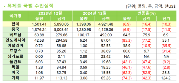 목제틀 국별 수입금액은 중국>베트남>인도네시아>이탈리아>프랑스 순이고 2024년 12월까지 누적 금액은 4,921천 달러. 약 66.4억 원이다. 전년 동월 대비 수입금액은 16.4% 감소했고 수입단가는 6.9% 하락했다. 수입국 중 중국이 금액으로 83.7%를 차지했고 물량으로 92.1% 차지했다.