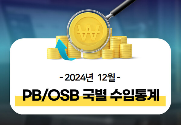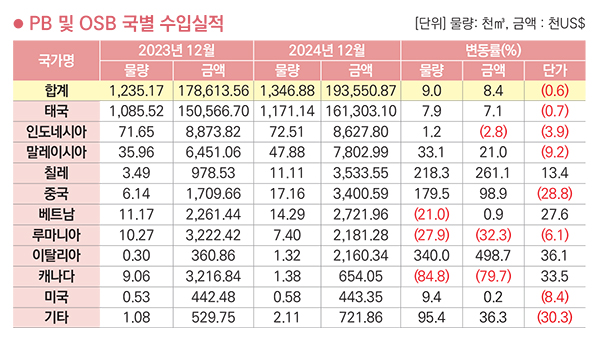 PB 및 OSB 국별 수입금액은 태국>인도네시아>말레이시아>칠레>중국 순이고 2024년 12월까지 누적 금액은 193,550천 달러. 약 2,612억 원이다. 전년 동월 대비 수입금액은 8.4% 증가했고 물량은 7.9% 증가, 단가는 0.6% 하락했다. 수입국 중 태국이 금액으로 83.4%를 차지했고 물량으로 87.3% 차지했다.