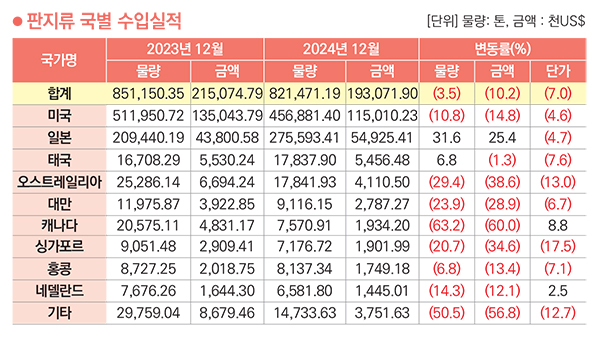 판지류 국별 수입금액은 미국>일본>태국>오스트레일리아>대만 순이고 2024년 12월까지 누적 금액은 193,071천 달러. 약 2,606억 원이다. 전년 동월 대비 수입금액은 10.2% 감소했고 물량은 3.5% 감소, 단가는 7.0% 하락했다. 수입국 중 미국이 금액으로 59.6%를 차지했고 물량으로 55.5% 차지했다.