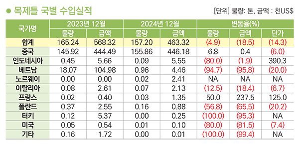 목제틀 국별 수입금액은 중국>인도네시아>베트남>노르웨이>이탈리아 순이고, 2025년 1월까지 금액은 463천 달러. 약 6.6억 원이다. 전년 동월 대비 수입금액은 18.5% 감소했고 수입단가는 14.3% 하락했다. 수입국 중 중국이 금액으로 96.3%를 차지했고 물량으로 98.7% 차지했다.