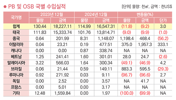 PB 및 OSB 국별 수입금액은 태국>중국>이탈리아>캐나다>베트남 순이고, 2025년 1월까지 금액은 16,547천 달러. 약 236억 원이다. 전년 동월 대비 수입금액은 9.2% 감소했고 물량은 11.8% 감소, 단가는 3.0% 상승했다. 수입국 중 태국이 금액으로 83.4%를 차지했고 물량으로 88.5% 차지했다.