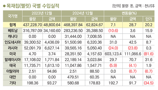 목재칩 국별 수입금액은 베트남>캐나다>인도네시아>러시아>미국 순이고, 2025년 1월까지 금액은 62,824천 달러. 약 898억 원이다. 전년동월 누계 대비 수입금액 28.7% 감소했고 물량은 7.1% 증가, 단가는 20.2% 감소했다. 수입국 중 베트남이 금액으로 56.3%를 차지했고 물량으로 60.4% 차지했다.