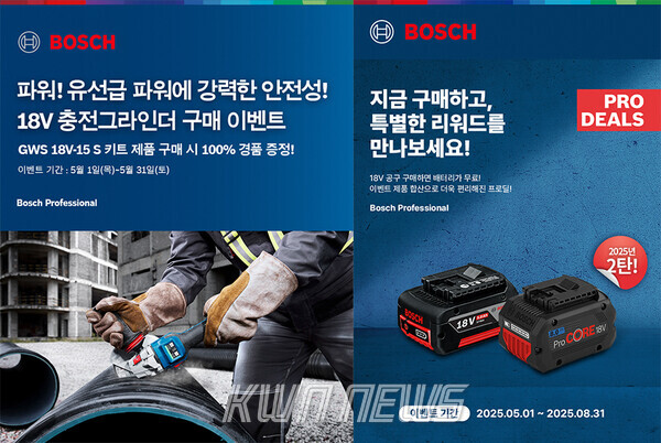 이 외에도 오는 8월 31일까지 4개월간 보쉬 전문가용 전동공구 18V 충전공구 제품을 구매하면 배터리를 증정하는 ‘프로딜 (PRO Deal) 2탄’ 이벤트도 함께 진행된다. 또한, 기간 내 두 이벤트 중복 참여가 가능하다.