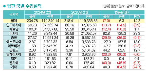 합판 수입금액은 인도네시아>베트남>러시아>중국>말레이시아 순이고 2025년 2월까지 누적 금액은 119,365천 달러. 약 1,706억 원이다. 전년 동월 누계 대비 수입금액은 6.3% 증가했고 물량은 7.0% 감소, 단가는 14.2% 상승했다. 수입국 중 인도네시아가 금액으로 26.8%를 차지했고 물량은 베트남이 46.5% 1위 차지했다.