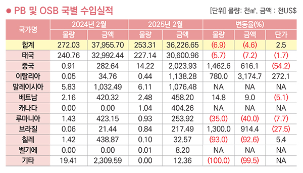 PB 및 OSB 국별 수입금액은 태국>중국>이탈리아>말레이시아>베트남 순이고 2025년 2월까지 누적 금액은 36,226천 달러. 약 518억 원이다. 전년 동월 대비 수입금액은 6.9% 감소했고 물량은 6.9% 감소, 단가는 2.5% 상승했다. 수입국 중 태국이 금액으로 84.5%를 차지했고 물량으로 89.7% 차지했다.
