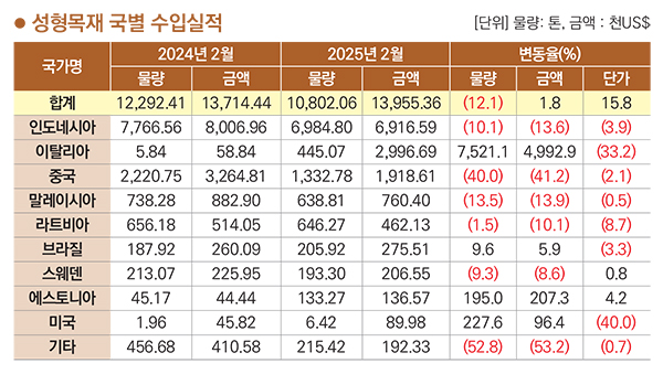 성형목재 국별 수입금액은 인도네시아>이탈리아>중국>말레이시아>라트비아 순이고 2025년 2월까지 누적 금액은 13,955천 달러. 약 199억 원이다. 전년 동월 누계 대비 수입금액은 1.8% 감소했고 물량은 12.1% 감소, 단가는 15.8% 하락했다. 수입국 중 인도네시아가 금액으로 49.5%를 차지했고 물량으로 64.6% 차지했다.