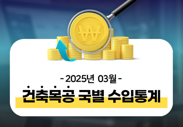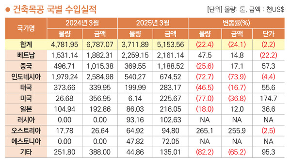 건축목공 국별 수입금액은 베트남>중국>인도네시아>태국>미국>일본 순이고 2025년 3월까지 누적 금액은 5,153천 달러. 약 69억 원이다. 전년 동월 누계 대비 수입금액은 24.1% 감소했고 물량은 22.4% 감소, 단가는 2.2% 하락했다. 수입국 중 베트남이 금액으로 41.9%를 차지했고 물량도 베트남이 60.8% 차지했다.