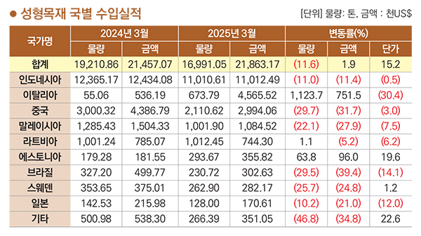 성형목재 국별 수입금액은 인도네시아>이탈리아>중국>말레이시아>라트비아 순이고 2025년 3월까지 누적 금액은 21,863천 달러. 약 295억 원이다. 전년 동월 누계 대비 수입금액은 1.9% 증가했고 물량은 11.6% 감소, 단가는 15.2% 상승했다. 수입국 중 인도네시아가 금액으로 50.4%를 차지했고 물량으로 65.1% 차지했다.