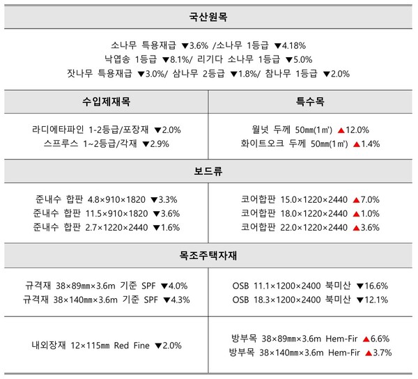 규격재가 약 4%, 11.1mm OSB가 16.6%, 레드파인 내장재가 2.0% 가격이 하락했다. 반면 방부목은 38×89 사이즈가 6.6%, 38×140 사이즈가 3.7% 올랐다. 준내수 합판 3×6 사이즈 4.8~11.5㎜ 2~3% 내렸다. 코어합판은 모든 규격에서 1~7%까지 올랐다. 내수합판, PB, 미송합판, MDF의 가격은 변동이 없었다. /윤형운 기자