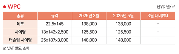 올해 3월에 비해 5월 목재가격은 일부 품목만 인상 또는 인하된 반면 시장 수요가 여전히 받쳐주지 못해 인상 또는 인하 폭은 크지 못하다. 국산 원목 2024년도 4/4분기 가격이 발표됐는데 대부분 2023년도 4/4분기 대비 모든 수종에서 하락했다. 건설 수요에 대응하는 낙엽송 원목이 8% 가량 하락했다. 수입제재목 중 스프루스 러시아산 각재 가격이 2.9% 하락했다. 북미산 특수목 중 월넛 건조 판재 가격이 12%가 올라 입방미터당 700만 원대를 기록했다. 화이트오크 건조 판재도 1.4%가 올라 입방미터당 620만 원대를 기록했다. 천연데크와 집성재 가격은 변동이 없었다. 방부목을 제외한 대부분의 목조주택용 자재의 가격이 내렸다.