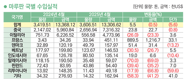 마루판 국별 수입금액은 중국>이탈리아>프랑스>덴마크>베트남 순이고 2025년 4월까지 누적 금액은 13,306천 달러. 약 191억 원이다. 전년 동월 누계 대비 수입금액은 0.5% 감소했고 물량은 5.5% 증가, 단가는 5.6% 하락했다. 수입국 중 중국이 금액으로 73.6%를 차지했고 물량으로 중국이 73.6%를 차지했다.