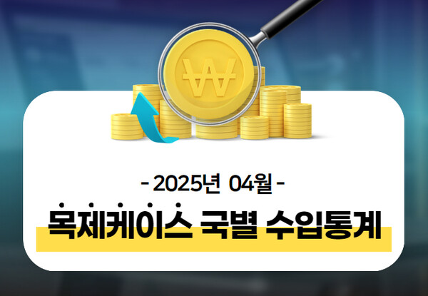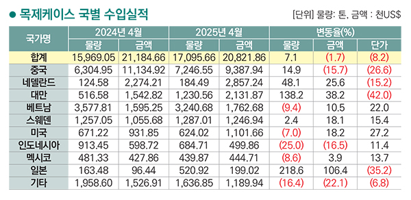 목제케이스 국별 수입금액은 중국>네덜란드>대만>베트남>스웨덴 순이고 2025년 4월까지 누적 금액은 20,821천 달러. 약 299억 원이다. 전년 동월 누계 대비 수입금액은 1.7% 감소했고 물량은 7.1% 증가, 단가는 8.2% 하락했다. 수입국 중 중국이 금액으로 45.0%를 차지했고 물량으로 42.3%를 차지했다.