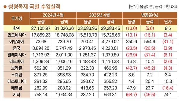 성형목재 국별 수입금액은 인도네시아>이탈리아>중국>말레이시아>라트비아 순이고 2025년 4월까지 누적 금액은 29,283천 달러. 약 421억 원이다. 전년 동월 누계 대비 수입금액은 5.6% 증가했고 물량은 13.0% 감소, 단가는 8.5% 상승했다. 수입국 중 인도네시아가 금액으로 53.7%를 차지했고 물량으로 65.9% 차지했다.