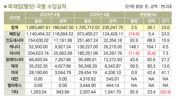 목재칩 국별 수입금액은 베트남>인도네시아>캐나다>러시아 순이고 2025년 4월까지 누적 금액은 235,247천 달러. 약 3,385억 원이다. 전년 동월 누계 대비 수입금액은 26.1% 증가했고 물량은 2.5% 증가, 단가 23.0% 상승했다. 수입국 중 베트남이 금액으로 52.7%를 차지했고 물량으로 56.4% 차지했다.