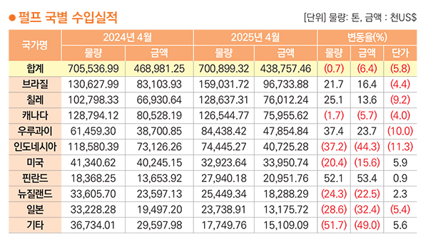 펄프 국별 수입금액은 브라질>칠레>캐나다>우루과이>인도네시아>미국 순이고 2025년 4월까지 누적 금액은 438,757천 달러. 약 6,313억 원이다. 전년 동월 누계 대비 수입금액은 6.4% 감소했고 수입물량은 0.7% 증가, 단가는 5.8% 하락했다. 수입국 중 브라질이 금액으로 22.0%를 차지했고 물량도 브라질이 22.7% 차지했다.