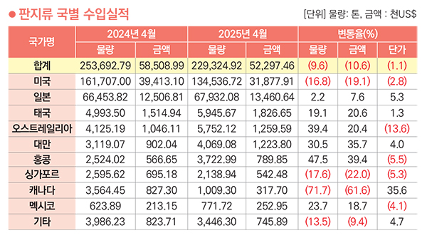 판지류 국별 수입금액은 미국>일본>태국>오스트레일리아>대만 순이고 2025년 4월까지 누적 금액은 52,297천 달러. 약 752억 원이다. 전년 동월 대비 수입금액은 10.6% 감소했고 물량은 9.6% 감소, 단가는 1.1% 하락했다. 수입국 중 미국이 금액으로 60.9%를 차지했고 물량으로 58.5% 차지했다.