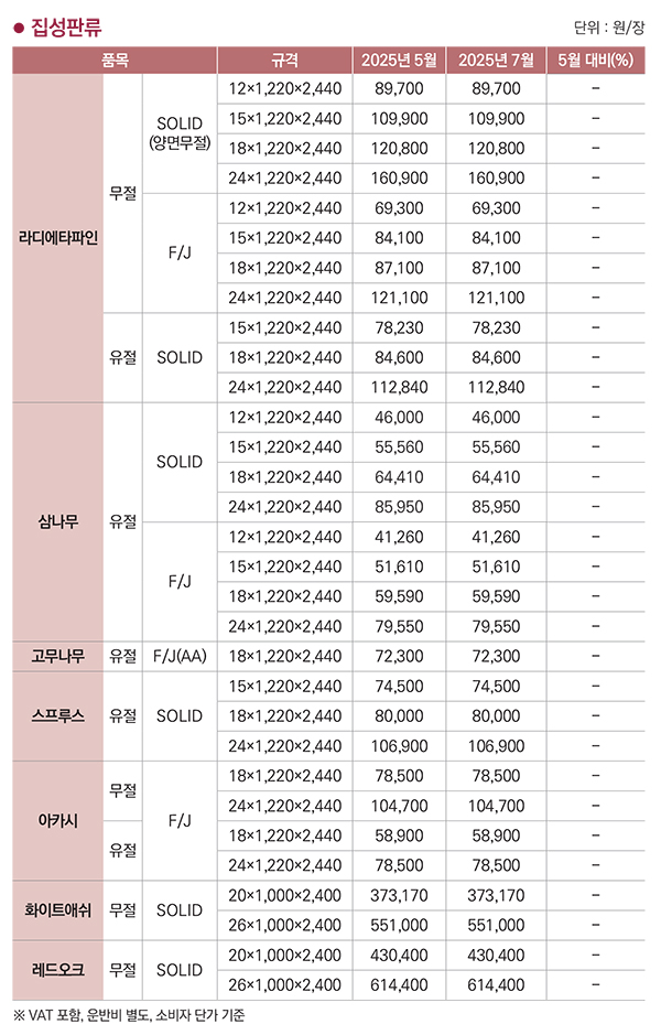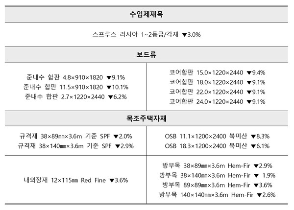 올해 5월에 비해 7월 목재가격은 일부 품목이 인하되었다. 여름 장마와 무더위에 시장 수요가 부진한 가운데 수요량이 많은 보드류와 목조주택 자재의 일부 가격이 인하됐다. 수입제재목 중 러시아산 스프루스 각재 가격이 수요부진으로 5월에 비해 3.0% 하락했다. 북미산 특수목 가격과 집성재, 천연 데크재 가격은 변동이 없었다. 보드류와 목조주택자재 가격은 대체로 하락추세인데 준내수 합판 3x6 사이즈 4.8~11.5㎜ 두께 일부 품목이 9~10% 내렸다. 코어합판은 모든 규격에서 약 9% 내렸다. PB, 미송합판, MDF의 가격은 변동이 없었다. 규격재가 약 2~3%, 11.1㎜ OSB가 8.3%, 레드파인 내장재가 3.6% 가격이 하락했다. 방부목은 38×89 사이즈가 2.9%, 38×140 사이즈가 1.9% 내렸다. /윤형운 기자