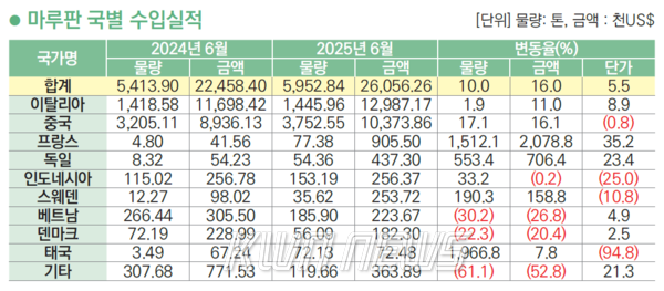마루판 국별 수입금액은 이탈리아>중국>프랑스>독일>인도네시아 순