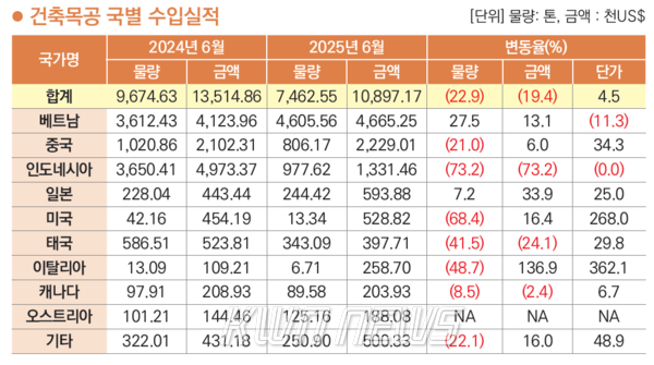 2025년 6월 건축목공 국별 수입실적