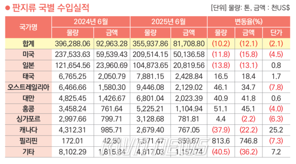 판지류 국별 수입금액은 미국>일본>태국>오스트레일리아>대만 순