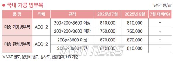올해 상반기에 이어 목재제품의 가격은 9월까지도 큰 변동이 없는 상황이다. 7월에 비해 9월 목재가격은 대부분 변동이 없었으나 합판류는 인상 품목이 있었고 목조주택자재는 품목에 따라 인상과 인하가 있었다. 9월 중순까지도 무더위가 지속되었고 시장 수요는 좀처럼 살아나지 않아 가격변동 폭은 거의 없었다.