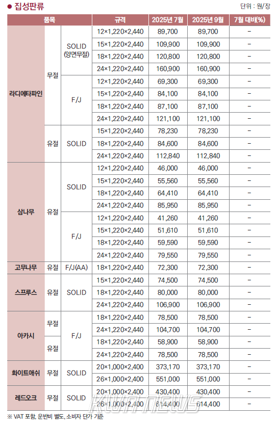 올해 상반기에 이어 목재제품의 가격은 9월까지도 큰 변동이 없는 상황이다. 7월에 비해 9월 목재가격은 대부분 변동이 없었으나 합판류는 인상 품목이 있었고 목조주택자재는 품목에 따라 인상과 인하가 있었다. 9월 중순까지도 무더위가 지속되었고 시장 수요는 좀처럼 살아나지 않아 가격변동 폭은 거의 없었다.