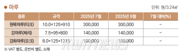 올해 상반기에 이어 목재제품의 가격은 9월까지도 큰 변동이 없는 상황이다. 7월에 비해 9월 목재가격은 대부분 변동이 없었으나 합판류는 인상 품목이 있었고 목조주택자재는 품목에 따라 인상과 인하가 있었다. 9월 중순까지도 무더위가 지속되었고 시장 수요는 좀처럼 살아나지 않아 가격변동 폭은 거의 없었다.