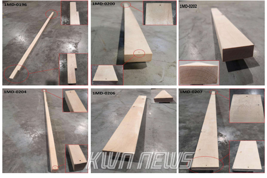- 설명 : 서로 다른 크기로 제작된 소파 프레임 제작용 부품들로, 네 면이 모두 대패질 및 라운딩(모서리 가공)되어 있음. 제공된 정보에 따르면 전체 34개의 부품 중, 14개 부품에는 직경 2㎜의 고정용 구멍이 뚫려 있고, 7개 부품에는 설치용 절개부(12×95㎜)가 있으며, 13개 부품은 네 면만 대패질 및 라운딩 처리되어 있음.
